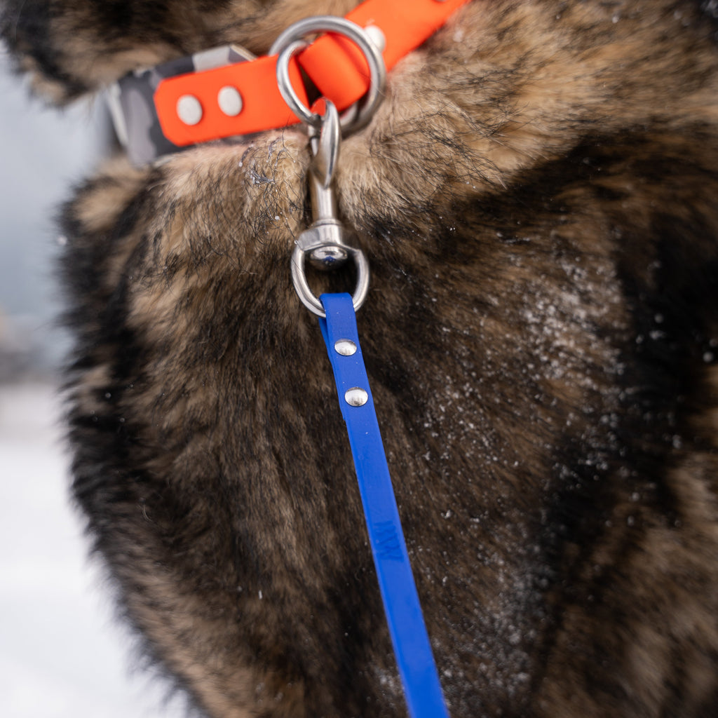 Our dog leash is made of standard military strength biothane®. It is resistant to water, temperature variations, dirt and odors. For maintenance, clean with water and a mild soap!